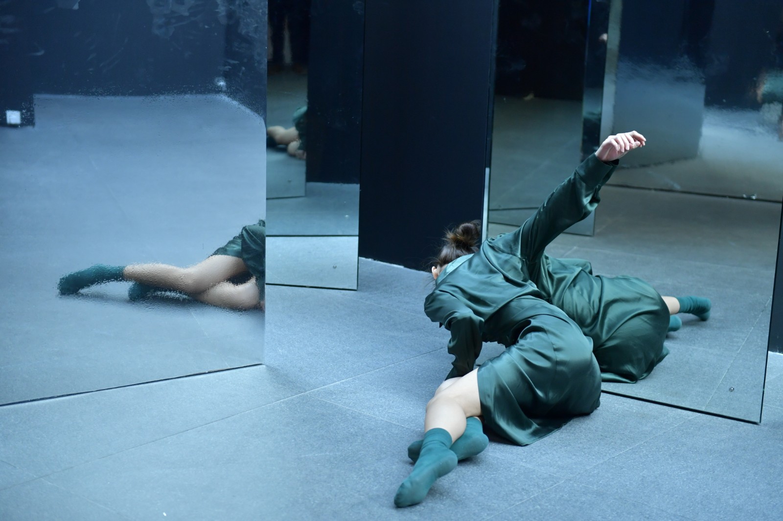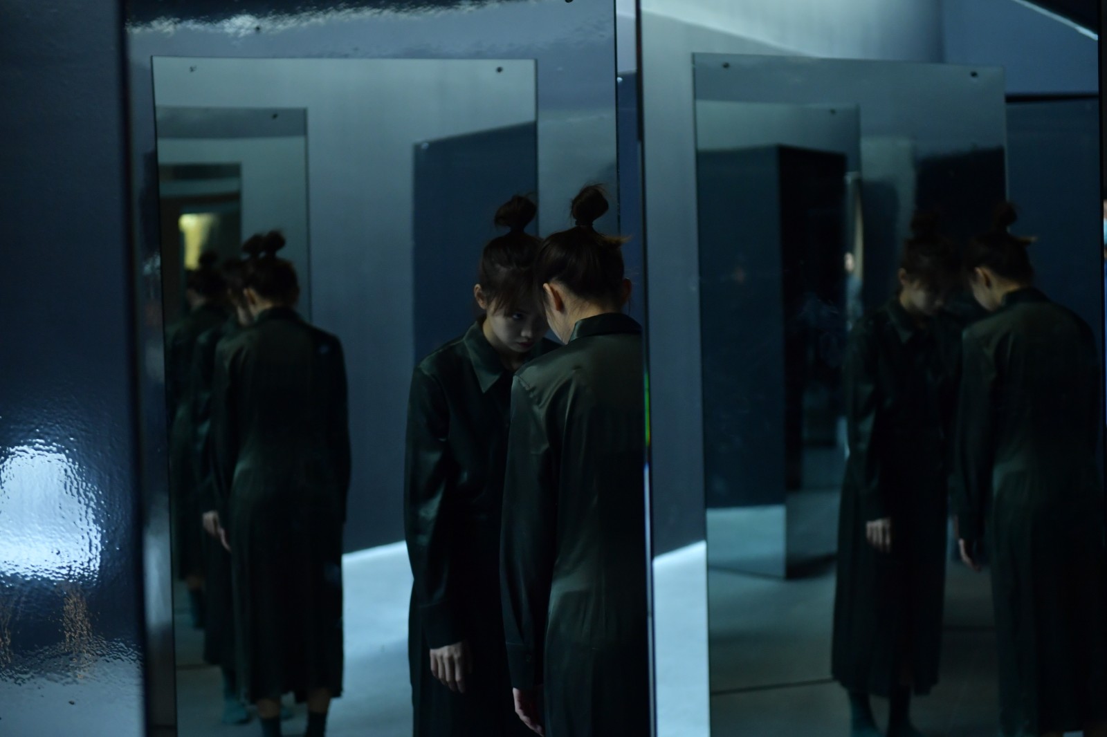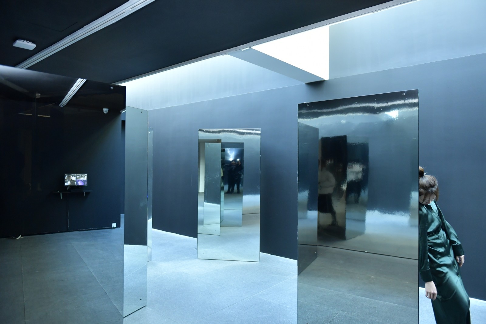 在OCAT研究中心展廳最明亮而寬闊的長(zhǎng)走廊上,紙老虎工作室借助六個(gè)鏡面反射的三棱柱營(yíng)造了一個(gè)劇場(chǎng)式的空間,邀請(qǐng)觀(guān)眾進(jìn)入并參與到劇目的演繹與發(fā)展中來(lái)。鏡面反射著“我”和周?chē)沫h(huán)境,清晰地呈現(xiàn)著“我”在環(huán)境中的位置。