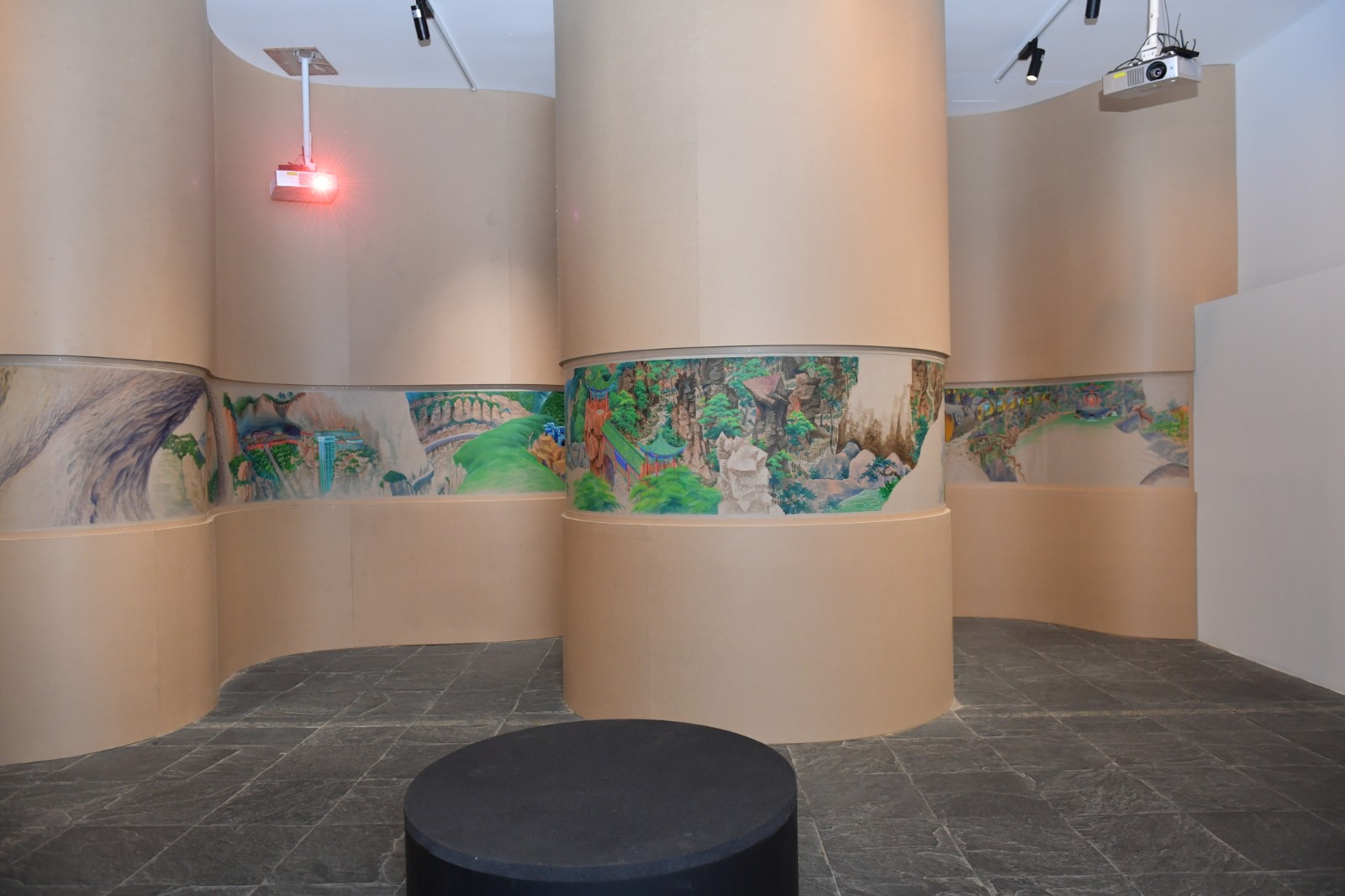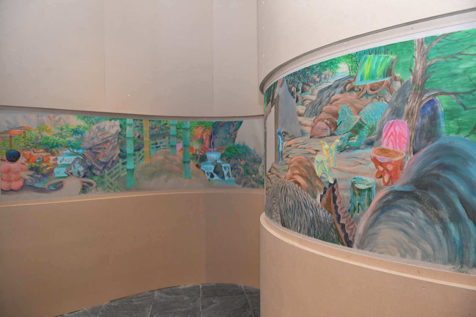 “地洞”一旁是展廳的下沉區(qū)域,這里被策展人設(shè)計(jì)為去往“桃花源”的實(shí)體路徑。梁碩的《景了個(gè)區(qū)》出現(xiàn)在這個(gè)下沉空間的一排四個(gè)口袋式的連續(xù)隔間墻面上,從空間上來(lái)說(shuō)是無(wú)比契合的?;仡櫫捍T2019年在北京公社的展覽《梁碩:景區(qū)》同樣可以見(jiàn)到這樣一種迂回的觀(guān)展路徑。“景區(qū)”這個(gè)概念的提出,在藝術(shù)家看來(lái)代表著今天人們對(duì)山水的理解,這個(gè)獨(dú)特的概念跨越了自然景觀(guān)與都市空間。梁碩在自己撰文的《景了個(gè)區(qū)》中復(fù)原了一個(gè)景區(qū)籌備建立起來(lái)的小故事,承包景區(qū)改造的劉工在工期接近尾聲時(shí),看到自己的“杰作”時(shí)不由感嘆:“這些水泥造物,居然都妥妥的在那了,像是本來(lái)就是從山里長(zhǎng)出來(lái)的,那巨大的假山石和假樹(shù)根顯得造型怪異,卻頗得陳老蓮氣韻,在落日的余暉中與真山融為一體,真山也像了假山……”[6]景區(qū)的建立勢(shì)必意味著人工、商業(yè)、消費(fèi)對(duì)自然景觀(guān)的直接侵入與改造,空間、審美、意識(shí)形態(tài)等一系列問(wèn)題由此發(fā)生。