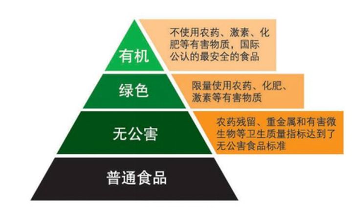 我國對農(nóng)產(chǎn)品的安全分類,包括有機(jī)、綠色、無公害三個(gè)等級。分別指對化肥、農(nóng)藥、激素、轉(zhuǎn)基因使用的不同要求。先看一張圖: