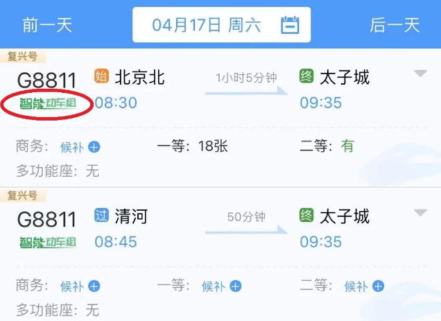 △在12306上購(gòu)買京張高鐵車票時(shí),該車型車次下方會(huì)有綠色“智能動(dòng)車組”字樣