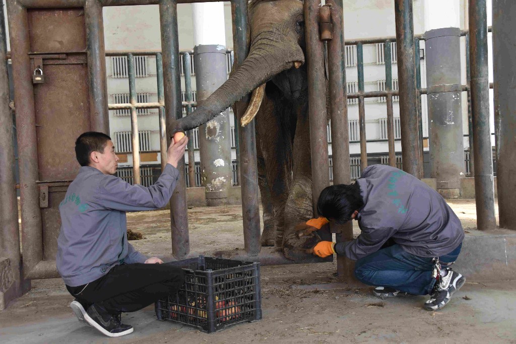 非洲象“豆豆”今年11歲,還在長(zhǎng)身體。這次體檢發(fā)現(xiàn),一個(gè)冬天“豆豆”個(gè)子長(zhǎng)了6cm,體重長(zhǎng)了150kg,牙齒長(zhǎng)長(zhǎng),腿長(zhǎng)粗,腳也長(zhǎng)大了。更讓“豆豆”喜歡的是,量完腳還有專業(yè)的修腳服務(wù)。