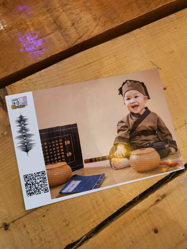 在這里,明信片不僅可以看,還能聽(tīng)!館內(nèi)富有科技范兒的有聲明信片是最受歡迎的。用手機(jī)上傳照片,錄制一個(gè)30秒以?xún)?nèi)的語(yǔ)音,這樣通過(guò)機(jī)器打印出來(lái)的明信片就有了新功能,只要用手機(jī)掃描明信片上的二維碼,就能聽(tīng)到專(zhuān)屬寄語(yǔ)。