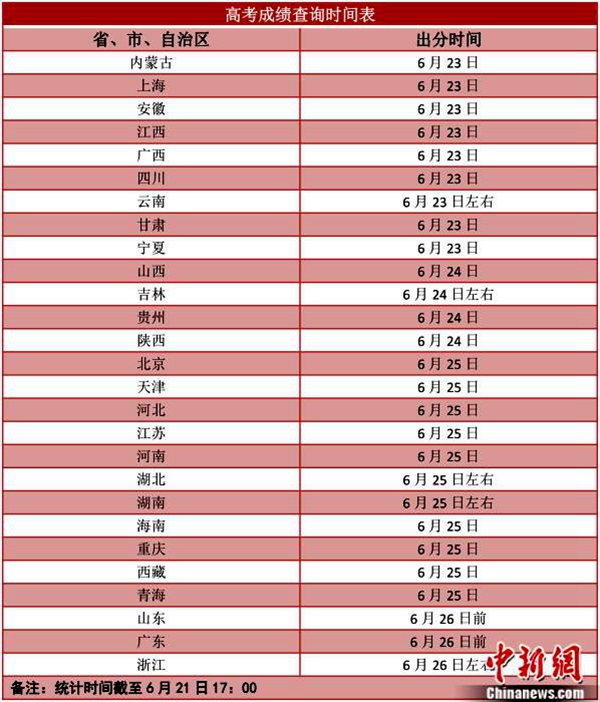根據(jù)各省份此前公布的時(shí)間,6月23日起各地將陸續(xù)公布高考成績,查分時(shí)間主要集中在23至26日。