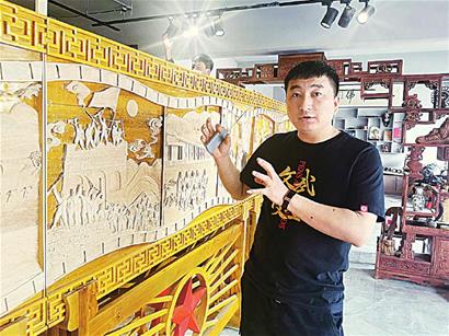 2019年,北安木雕被列入黑龍江省非物質(zhì)文化遺產(chǎn)代表性項(xiàng)目名錄,這門(mén)技藝日漸迎來(lái)屬于自己的“高光時(shí)刻”。北安市政府支持優(yōu)秀文化發(fā)展,扶持像李寶峰這樣的手藝人,為他免費(fèi)提供500余平方米場(chǎng)地用來(lái)展覽作品和推廣木雕技藝,藝術(shù)館內(nèi)展出了李寶峰上百件木雕作品。