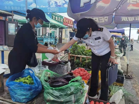 執(zhí)法人員現(xiàn)場(chǎng)發(fā)放《黑河市市場(chǎng)監(jiān)督管理局食品安全“你點(diǎn)我檢”調(diào)研問(wèn)卷》46份,并根據(jù)調(diào)研問(wèn)卷統(tǒng)計(jì)結(jié)果隨機(jī)抽取大集上售賣(mài)的熟食、水果、蔬菜等樣品。