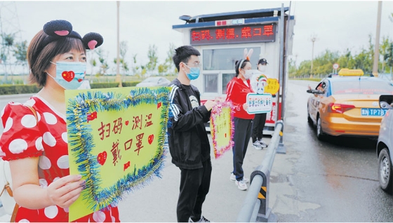 圖為志愿者在交通路口進(jìn)行防疫宣傳