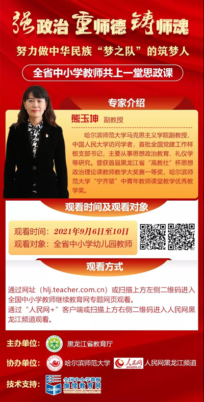 據(jù)了解,自9月6日至10日省教育廳將組織開展“全省中小學(xué)教師共上一堂思政課”活動(dòng),將邀請專家學(xué)者就提升思想政治素質(zhì)和師德水平、更好擔(dān)負(fù)起立德樹人根本任務(wù)為全省中小學(xué)教師授課。本次活動(dòng)將以線上課堂形式舉辦。參加人員通過全國中小學(xué)教師繼續(xù)教育網(wǎng)專題網(wǎng)頁收聽收看。