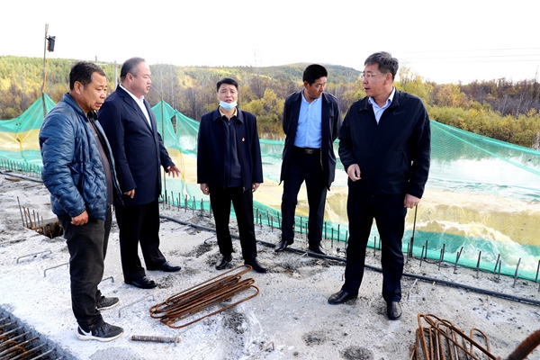 林業(yè)局黨委副書(shū)記、局長(zhǎng)韓鳳泉(右一)深入在建楚龍溝大橋現(xiàn)場(chǎng)落實(shí)泄洪措施,確保國(guó)道G111安全。
