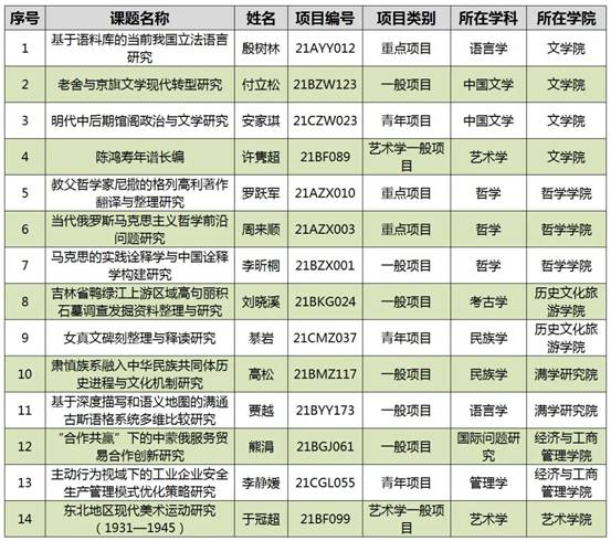 黑龍江經(jīng)濟網(wǎng)訊(黑龍江日報全媒體見習(xí)記者董廣碩 商祺)日前,全國哲學(xué)社會科學(xué)工作辦公室公布了2021年國家社科基金年度項目和青年項目立項名單。本年度國家社科基金共立項目4642項,其中重點項目370項,每項資助35萬元;一般項目3169項,青年項目1103項,資助額度均為20萬元。連同之前公布的藝術(shù)學(xué)科項目,黑龍江大學(xué)共獲得2021年國家社科基金年度項目和青年項目14項。其中重點項目3項、一般項目6項、青年項目3項、藝術(shù)學(xué)一般項目2項,立項總數(shù)居全省第1位。