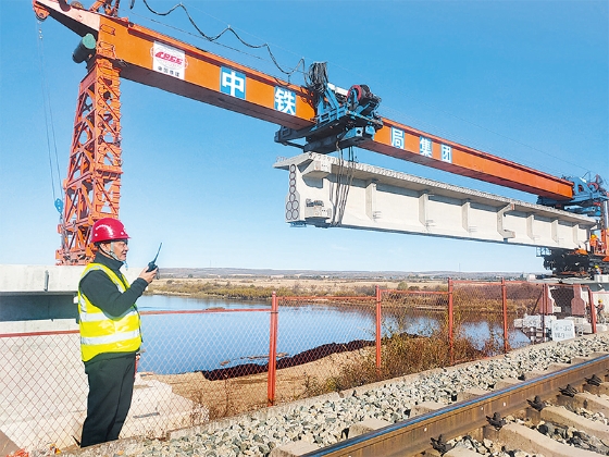 據(jù)介紹,前不久北黑鐵路升級改造工程新建24座鐵路橋中的另一座孫吳段大河口中橋架梁已經(jīng)完成。橋梁位于孫吳縣境內(nèi),橋長112.73米,孔跨布置為3×32米,下部結(jié)構(gòu)和T梁預(yù)制施工由中鐵十局完成,梁體架設(shè)由中鐵十六局集團第五工程有限公司負(fù)責(zé)完成。