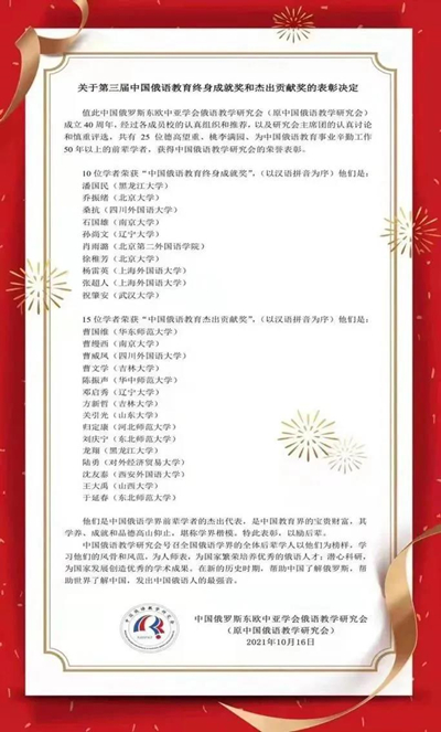 今年恰逢黑龍江大學(xué)建校、黑龍江大學(xué)俄語學(xué)院建院80周年。八十年來,眾多德才兼?zhèn)涞膬?yōu)秀教師為黑大俄語專業(yè)建設(shè)、為中國(guó)俄語教育事業(yè)發(fā)展貢獻(xiàn)了畢生力量。李錫胤教授、華劭教授與張家驊教授曾獲“中國(guó)俄語教育終身成就獎(jiǎng)”,鄭述譜教授與金亞娜教授曾獲“中國(guó)俄語教育杰出貢獻(xiàn)獎(jiǎng)”。此次潘國(guó)民教授與龍翔教授榮獲表彰,再次肯定了黑龍江大學(xué)老一輩俄語教師對(duì)國(guó)家俄語教育事業(yè)發(fā)展做出的突出貢獻(xiàn)。