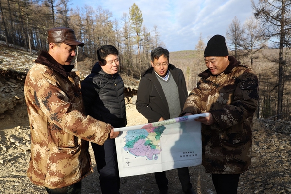 圖為阿木爾林業(yè)局黨委副書記、局長韓鳳泉(右二)深入到2—1線檢查新開通路線施工進展情況(王力/攝)
