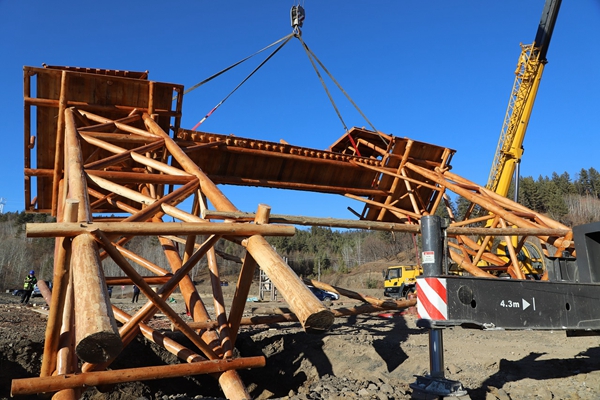 早上10點(diǎn)58分,只見平靜的林業(yè)局薩布素軍馬場(chǎng)頓時(shí)熱鬧了起來(lái),兩臺(tái)大型起重機(jī)發(fā)動(dòng)機(jī)嗡嗡作響,一東一西緩慢吊起10多噸重的大門,因偏向一側(cè)首次作業(yè)沒有成功。安裝技術(shù)人員調(diào)整重心點(diǎn),第二次試舉,并在一臺(tái)裝載機(jī)的協(xié)助下,調(diào)整機(jī)位,歷時(shí)2個(gè)多小時(shí),才將具有濃郁驛站文化風(fēng)格的高10米、寬14米的木質(zhì)大門,矗立在平地上。