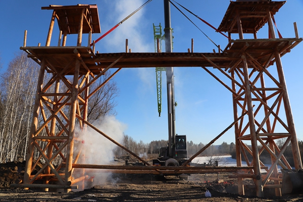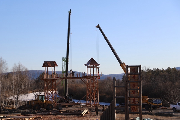 阿木爾林業(yè)局薩布素景區(qū)的薩布素軍馬場(chǎng)大門被緩緩起吊起來(lái)(王力/攝)
