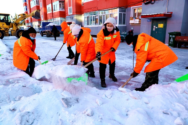 在清掃過程中,環(huán)衛(wèi)職工冒著零下30多度的嚴(yán)寒,移動車輛、鏟除積雪、揮舞工具,僅用40多分鐘完成了一棟樓前硬化地面的清理任務(wù)。
