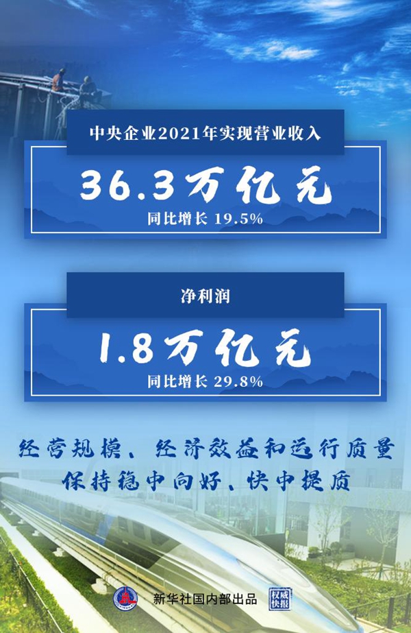 2021年,中央企業(yè)完成固定資產(chǎn)投資(不含房地產(chǎn))3.2萬億元,同比增長10.1%;上繳稅費2.4萬億元,同比增長20%;截至去年末中央企業(yè)資產(chǎn)負債率保持在64.9%,圓滿完成預期目標。