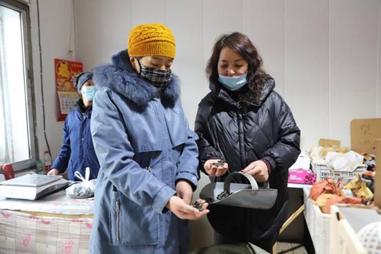 阿木爾菌業(yè)負(fù)責(zé)人趙榮華(右一)在向顧客介紹黑木耳的泡發(fā)率等指標(biāo)(王力 攝)