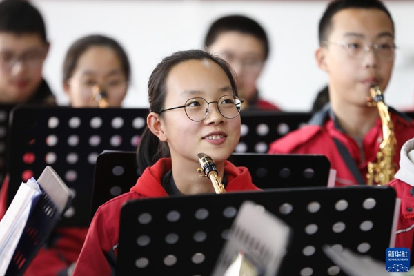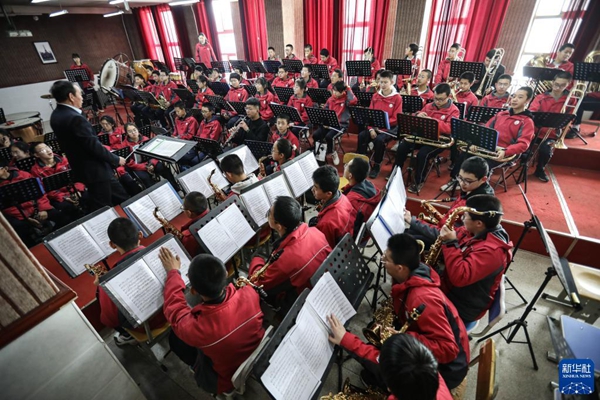 2022年寒假,在甘肅省白銀市會(huì)寧縣,會(huì)師中學(xué)交響管樂團(tuán)的孩子們?cè)谕瓿珊僮鳂I(yè)之余排練《紅旗頌》。早在2011年,會(huì)寧縣會(huì)師中學(xué)就東挪西借組建了第一個(gè)交響樂樂團(tuán)。平時(shí),學(xué)校為樂團(tuán)的學(xué)生免費(fèi)上樂器課,學(xué)生自愿報(bào)名參加、自愿購買小型樂器。如今,《紅旗頌》《長(zhǎng)征組歌》等已成為樂團(tuán)的保留曲目。