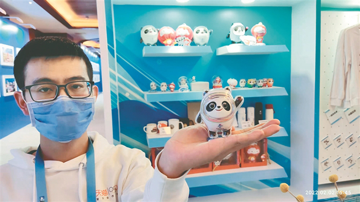 在新聞中心一樓中庭及走廊設有2022年冬奧會熱銷特許商品展區(qū),為媒體提供線上定制和購買特許商品服務。遺憾的是經(jīng)過1日一天的熱賣,幾乎所有“冰墩墩”玩偶都已告罄,可見媒體記者也敵擋不住超級可愛的冰墩墩的魅力。