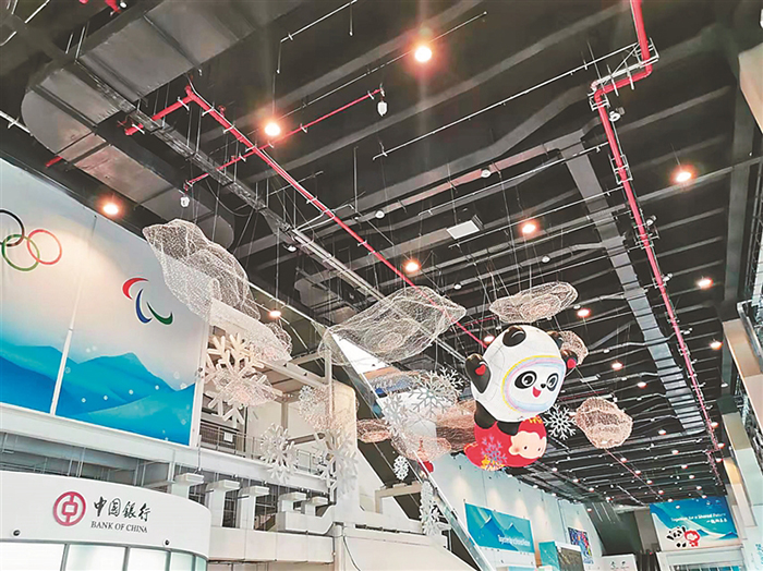 進入主媒體中心一層,懸在半空中碩大的冰墩墩和雪容融頗為吸睛,很多媒體記者爭相與其合影。不遠處,一塊巨大電子高清屏幕,正播放著短道速滑世界杯的比賽視頻,畫面清晰得如同親臨賽場。