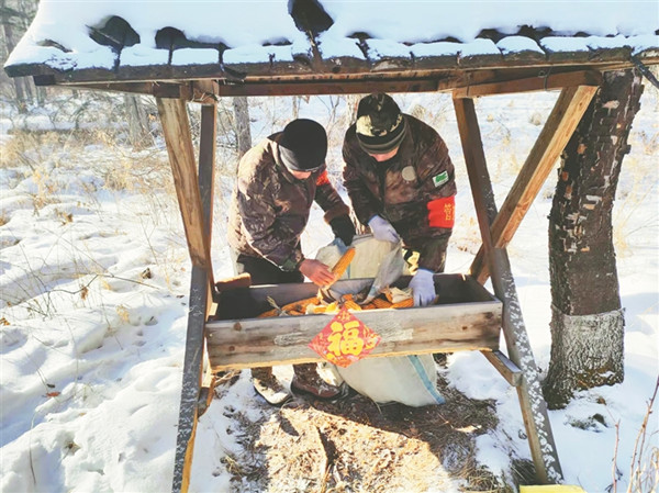 同一時間,青山林場的巡護(hù)隊員來到53林班補(bǔ)飼點(diǎn),貼福字,送“年貨”?!斑@過年了,狍子野豬的食物也得提檔升級。咱們過年吃餃子,它們也得吃點(diǎn)好的。”隊員王振林邊擺放著玉米、豆餅粉、白菜、蘿卜等食物邊調(diào)侃著。