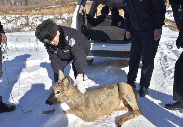 2月2日,正值大年初二,塔河縣公安局森保大隊(duì)民警接到鎮(zhèn)內(nèi)群眾的報(bào)警求助電話,稱一只疑似狍子的野生動(dòng)物誤闖進(jìn)自己家倉庫院內(nèi),民警立刻趕往現(xiàn)場。到達(dá)現(xiàn)場后,民警判斷這是一只成年狍子。報(bào)警群眾稱和親戚費(fèi)了不少勁才把這只誤闖居民區(qū)的袍子抓住,為了防止其亂跑受到意外傷害專門用繩子將其腿系住,然后立刻報(bào)了警。經(jīng)過仔細(xì)查驗(yàn),森保民警確認(rèn)袍子沒有明顯傷病。在精心照顧和觀察了兩個(gè)小時(shí)后,看到其行動(dòng)能力正常,精神狀態(tài)良好,符合放生條件后,森保大隊(duì)民警和報(bào)警群眾將這只狍子放歸了大自然?!鞍菽辍贬笞釉谕瓿闪俗约旱男脑负笤谌藗兊哪克拖職g快地回歸了山林。