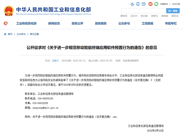 據(jù)工信部網(wǎng)站16日消息,工信部公開征求對《關(guān)于進一步規(guī)范移動智能終端應(yīng)用軟件預(yù)置行為的通告》的意見?!锻ǜ妗诽岢觯a(chǎn)企業(yè)應(yīng)確保除基本功能軟件外的預(yù)置應(yīng)用軟件均可卸載,并提供安全便捷的卸載方式供用戶選擇。全文如下: