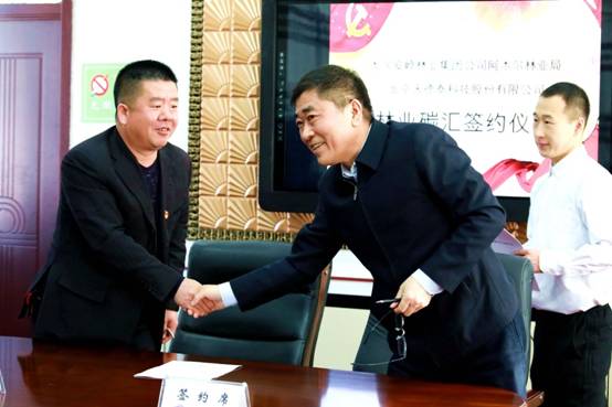 阿木爾林業(yè)局副局長李玉峰與北京天得泰科技股份有限公司副董事長、專家委員會主席孫樹鎖相互握手,慶賀簽約文本,開啟碳匯經(jīng)濟(jì)產(chǎn)業(yè)發(fā)展之路(王力 攝)
