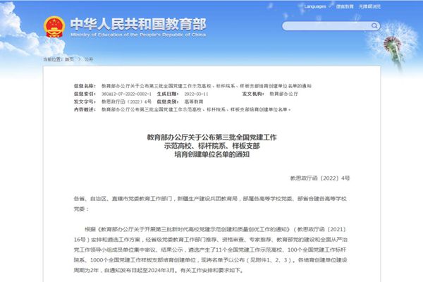 根據(jù)《教育部辦公廳關(guān)于開展第三批新時代高校黨建示范創(chuàng)建和質(zhì)量創(chuàng)優(yōu)工作的通知》(教思政廳函〔2021〕16號)安排,經(jīng)省級黨委教育工作部門推薦、專家評審等環(huán)節(jié),教育部遴選產(chǎn)生了11個全國黨建工作示范高校、100個全國黨建工作標桿院系、1000個全國黨建工作樣板支部培育創(chuàng)建單位。各培育創(chuàng)建單位建設周期為2年,自通知發(fā)布日起至2024年3月。