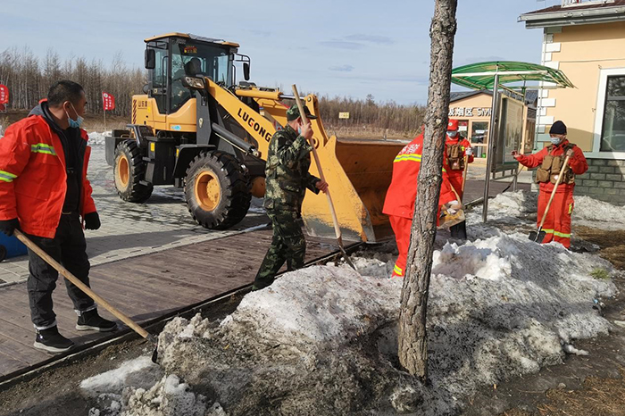 塔源林場(chǎng)組織人員清理北山綜合服務(wù)積雪、雜物(孫秀艷 攝)