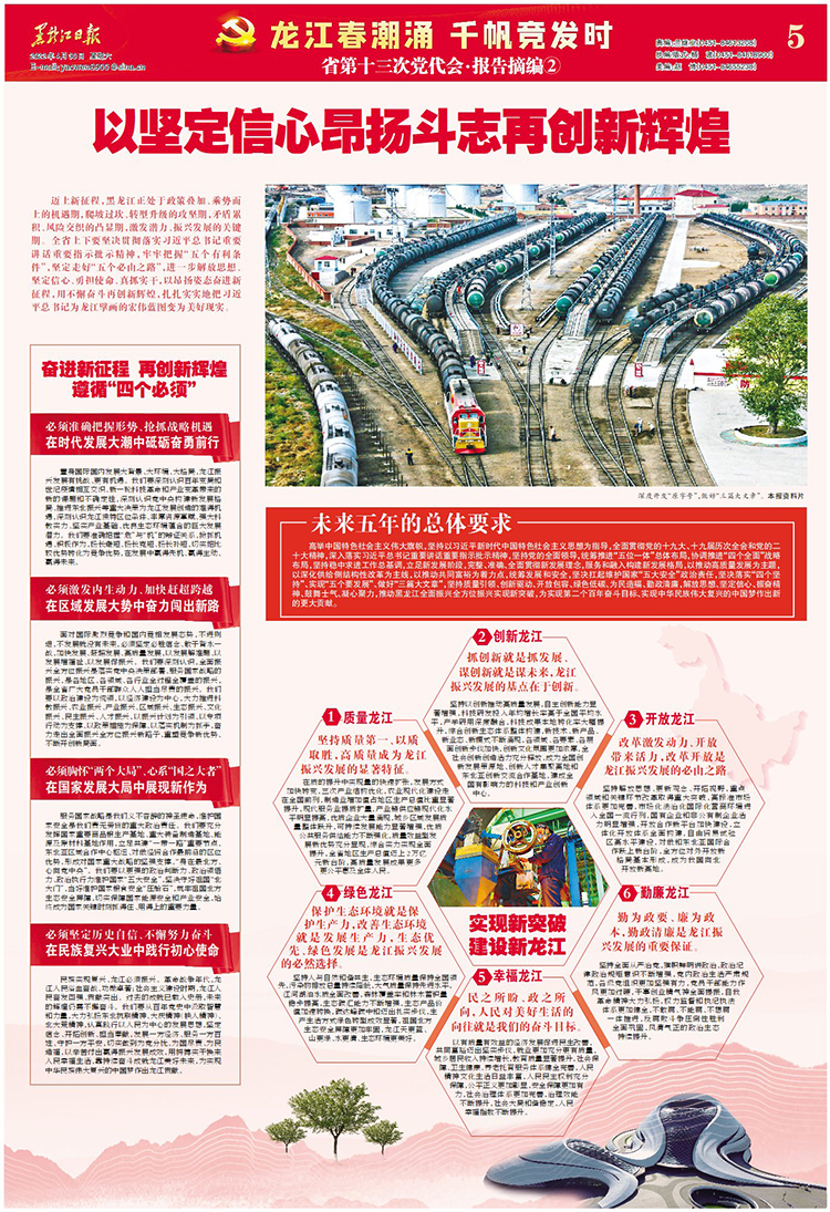 邁上新征程,黑龍江正處于政策疊加、乘勢而上的機(jī)遇期,爬坡過坎、轉(zhuǎn)型升級的攻堅(jiān)期,矛盾累積、風(fēng)險(xiǎn)交織的凸顯期,激發(fā)潛力、振興發(fā)展的關(guān)鍵期。全省上下要堅(jiān)決貫徹落實(shí)習(xí)近平總書記重要講話重要指示批示精神,牢牢把握“五個有利條件”,堅(jiān)定走好“五個必由之路”,進(jìn)一步解放思想、堅(jiān)定信心、勇?lián)姑?、真抓?shí)干,以昂揚(yáng)姿態(tài)奮進(jìn)新征程,用不懈奮斗再創(chuàng)新輝煌,扎扎實(shí)實(shí)地把習(xí)近平總書記為龍江擘畫的宏偉藍(lán)圖變?yōu)槊篮矛F(xiàn)實(shí)。
