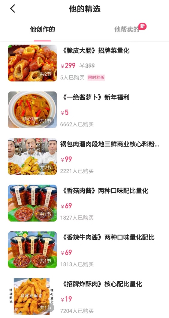 作為一位有著25年美食領(lǐng)域從業(yè)經(jīng)驗的老廚師,韓總廚憑借一手精湛的廚藝,來到快手后很快就積累了上萬粉絲,為他打造付費課程奠定了基礎(chǔ)?!皩Ρ攘似渌_人的內(nèi)容,我覺得自己還是有一定的內(nèi)容優(yōu)勢的,所以也試著做了課程,看看是否有人愿意購買?!?