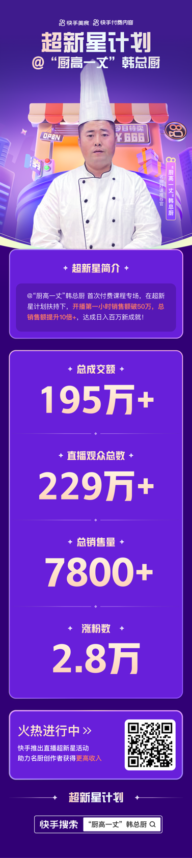 前不久,快手美食主播“廚高一丈韓總廚”(快手ID:hanzhongchu666888)參加了快手官方舉辦的“超新星計劃”,開啟付費課程直播專場,最終取得總成交額195萬+,總銷售量7800+的亮眼成績。