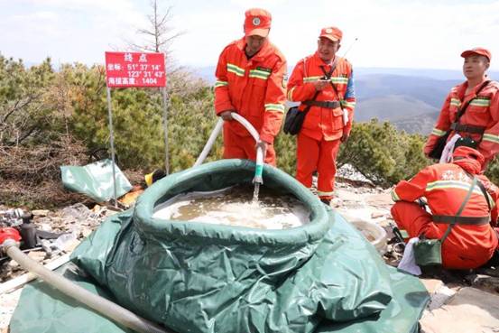 據(jù)了解,此次演練模擬小白山最高峰海拔1404米的“興安第一塔”附近偃松林發(fā)生火情,在海拔886米尋找到一處水源地,撲火隊(duì)員利用高揚(yáng)程山地引水泵向1150米處放置的儲(chǔ)水囊供水,同時(shí)架設(shè)第二臺(tái)水泵向山頂供水,兩臺(tái)水泵交叉接力成功將水引向小白山最高峰,噴淋“興安第一塔”,整個(gè)過程鋪設(shè)水帶全長3740延長米,垂直爬高519米。