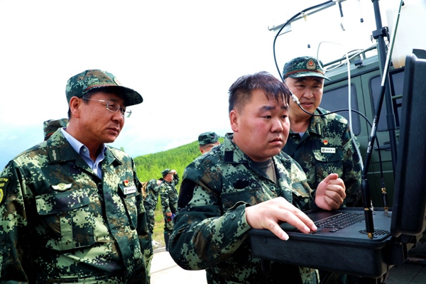 阿木爾林業(yè)局黨委副書記、局長、局防指總指揮韓鳳泉(左二)在查看無人機狀況(王力 攝)
