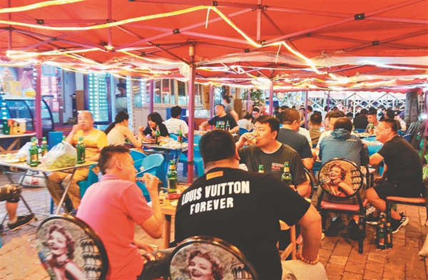 夜幕降臨,冰城街路的大排檔里,人們一邊吃著燒烤海鮮,一邊喝著啤酒,談天說地,不亦樂乎……仲夏六月,在大排檔允許外擺政策的推動(dòng)下,夏日“夜經(jīng)濟(jì)”越來越火熱,冰城濃濃的“煙火氣”回歸。大排檔既豐富了市民生活,冰城的快樂消費(fèi)也開始了。