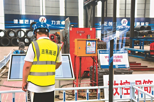 鋼筋加工車間里一處3D立體投影,讓工人們可以直觀看到自己加工后的構(gòu)件將用于整體鋼筋骨架的哪個(gè)部位。任書法說(shuō),吉黑高速項(xiàng)目打造智慧梁廠,采用了數(shù)控鋼筋滾焊機(jī)、數(shù)控鋼筋剪切生產(chǎn)線、數(shù)控鋼筋彎曲中心+自動(dòng)上料配套等設(shè)備,以前這么大的加工廠要30多人,現(xiàn)在只需一半的人力,就能干出兩倍的工作量,極大提高了施工精度和效率。