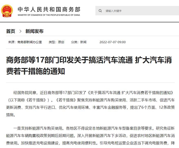 日前,商務部等17部門印發(fā)了《關于搞活汽車流通 擴大汽車消費若干措施的通知》,《措施》聚焦支持新能源汽車購買使用、活躍二手車市場、促進汽車更新消費、支持汽車平行進口、優(yōu)化汽車使用環(huán)境、豐富汽車金融服務等,提出了6個方面、12條政策措施。