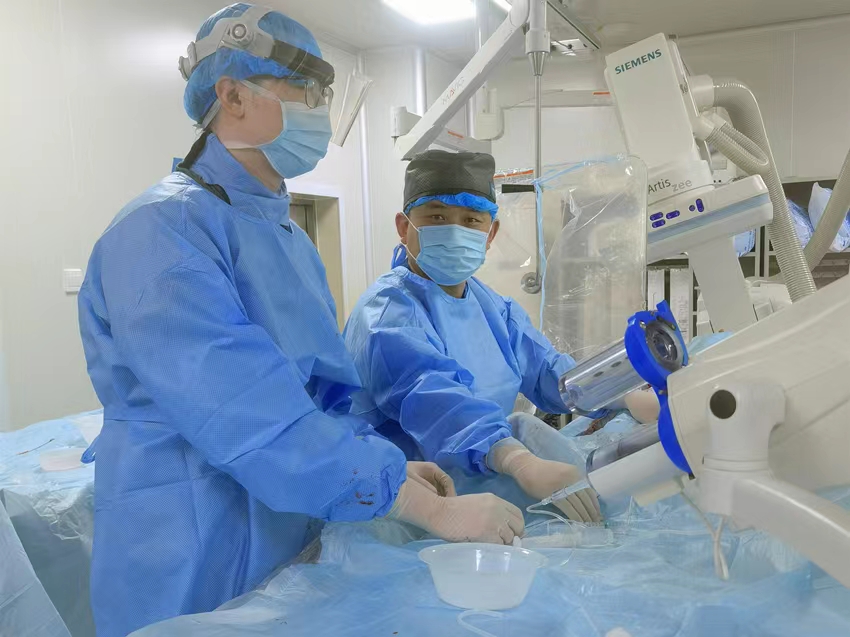 “患者入院后雖進(jìn)行了快速靜脈溶栓,但病情依然進(jìn)展性加重,我們發(fā)現(xiàn)患者病情為顱內(nèi)主干血管閉塞導(dǎo)致,情況十分危急,如果不及時(shí)介入開通閉塞的顱內(nèi)大血管,一旦錯(cuò)過治療最佳時(shí)機(jī),患者就可能會(huì)出現(xiàn)危及性命等情況?!泵F副主任醫(yī)師回憶了當(dāng)時(shí)搶救情景。搶救刻不容緩,在爭(zhēng)得家屬同意并簽字后,神經(jīng)介入團(tuán)隊(duì)立即將張先生送至導(dǎo)管室進(jìn)行介入取栓治療。