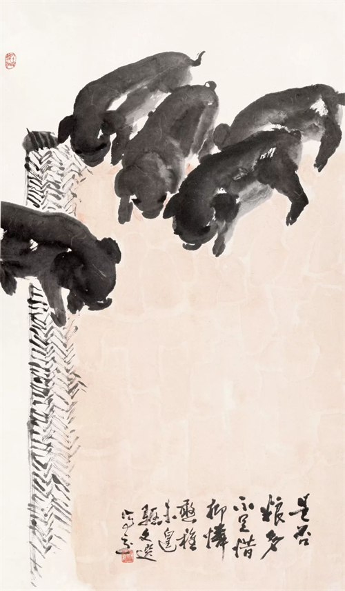 湯文選的人物、山水、花鳥(niǎo)、墨虎等一系列作品,融會(huì)著、貫穿著“三種傳統(tǒng)”?;螂[或顯,或化解之,或凝聚之,或熔裁之,或獨(dú)造之?!叭N傳統(tǒng)”,可概括為現(xiàn)實(shí)主義在中國(guó)畫(huà)發(fā)展歷程中的三段式,亦曰交叉出現(xiàn)的不同歷史內(nèi)涵、文化反映的三種藝術(shù)狀態(tài):首先,是古代現(xiàn)實(shí)主義傳統(tǒng)——“外師造化,中得心源”。其二,是“五四”現(xiàn)實(shí)主義傳統(tǒng)——融合西法,崇尚寫(xiě)實(shí)。其三,是新中國(guó)成立后倡導(dǎo)的革命現(xiàn)實(shí)主義傳統(tǒng)。深入火熱斗爭(zhēng),深入工農(nóng)兵。學(xué)習(xí)延安木刻,學(xué)習(xí)民間年畫(huà),學(xué)習(xí)蘇聯(lián)油畫(huà)現(xiàn)實(shí)主義的創(chuàng)作方法(50年代)。其后,“一手伸向生活,一手伸向傳統(tǒng)”(60年代)。在以上“三種傳統(tǒng)”的交匯點(diǎn)上,伸延出湯文選早期和中期的現(xiàn)實(shí)主義創(chuàng)作之路。湯文選中國(guó)畫(huà)藝術(shù)的現(xiàn)實(shí)主義,其主要特征為積極的入世態(tài)度,強(qiáng)烈的人文主義色彩,個(gè)性、民族性與時(shí)代性的完美統(tǒng)一,以及嚴(yán)肅的歷史使命感。