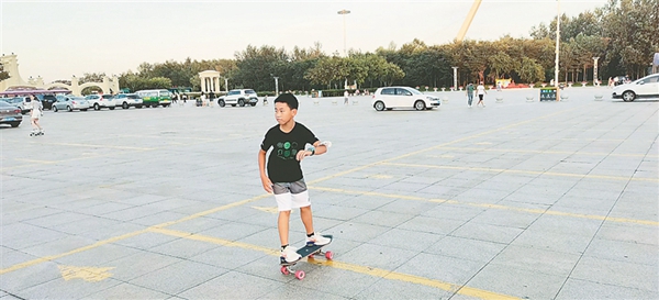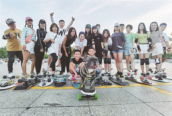 7月21日18時(shí)許,太陽島地鐵站出口附近的小廣場,一群人抱著陸沖板陸續(xù)趕到,其中“80后”“90后”居多,還有帶孩子來的“寶媽”。不少人來的時(shí)候穿著上班的職業(yè)裝,換上圓領(lǐng)T恤,戴上鴨舌帽,配齊護(hù)具,簡單熱身后,迫不及待地開滑。