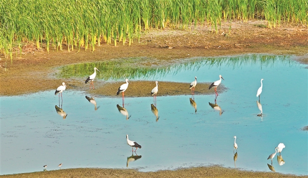 “此次現(xiàn)身的東方白鸛數量有近百只,且已在濕地停留10余日。以往東方白鸛只有在春秋遷徙季節(jié)才經停安邦河濕地,在這個季節(jié)現(xiàn)身,屬史上首次?!卑舶詈訚竦刈匀槐Wo區(qū)管理局旅游科科長王偉介紹。