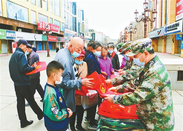 在伊美區(qū)步行街活動現(xiàn)場,市人防辦工作人員向市民發(fā)放宣傳單和宣傳手冊(郭強/攝)。