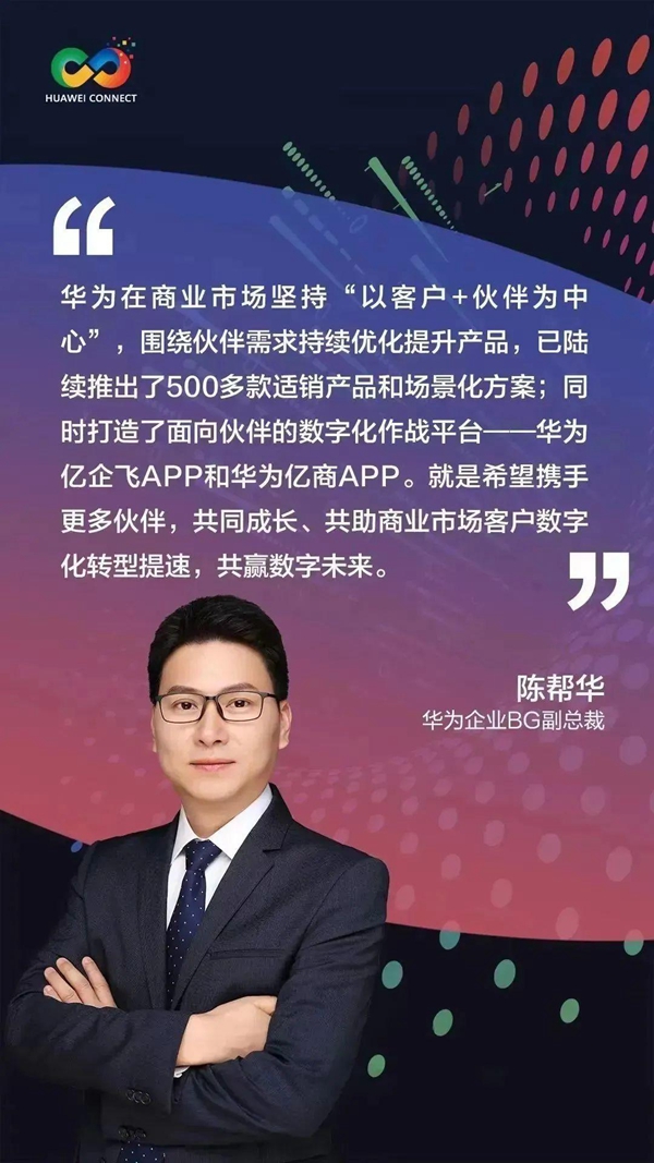 對(duì)此,陳幫華表示,華為在商業(yè)市場(chǎng)堅(jiān)持“以客戶+伙伴為中心”,圍繞伙伴需求持續(xù)優(yōu)化提升產(chǎn)品,已陸續(xù)推出了500多款適銷產(chǎn)品和場(chǎng)景化方案;同時(shí)打造了面向伙伴的數(shù)字化作戰(zhàn)平臺(tái)——華為億企飛APP和華為億商APP。就是希望攜手更多伙伴,共同成長(zhǎng)、共助商業(yè)市場(chǎng)客戶數(shù)字化轉(zhuǎn)型提速,共贏數(shù)字未來。