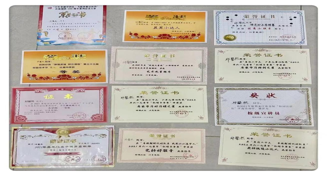 在成長過程中,面對學習,她不斷挑戰(zhàn)自我,勇于創(chuàng)新,努力去探索新領域,收獲新知識。邱馨然不僅熱愛學習,而且注重興趣的發(fā)展,先后獲得中國歌劇舞劇院頒發(fā)的全國社會藝術水平考級朗誦九級,中國舞蹈家協(xié)會頒發(fā)中國舞九級,中國音樂學院頒發(fā)古箏二級,文化和旅游部發(fā)展中心頒發(fā)硬筆書法四級,中國文化信息協(xié)會頒發(fā)“文明與藝術”少年英才藝術全國總展演獨舞一級等11個國家級獎項和30多個省級、市級、區(qū)級、校級獎項。