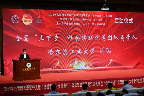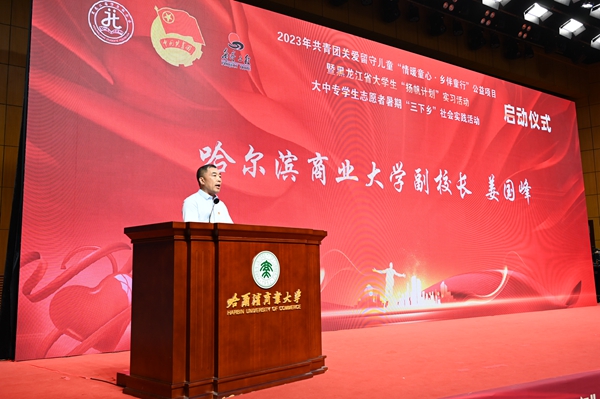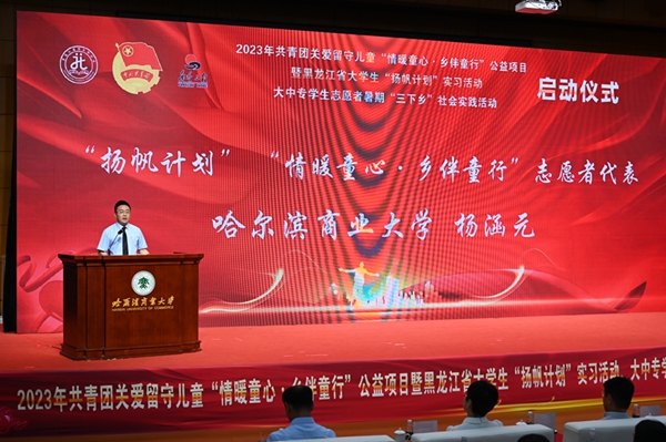 本次活動(dòng),在哈爾濱商業(yè)大學(xué)的大力支持下順利開展,哈爾濱商業(yè)大學(xué)副校長(zhǎng)姜國(guó)鋒在儀式上致辭,他說:“學(xué)校建校71年來,立足立德樹人根本任務(wù),聚焦‘為黨育人,為國(guó)育才’的職責(zé)使命,在不斷加強(qiáng)‘第一課堂’建設(shè)的同時(shí),還依托學(xué)?!惑w兩翼’文化育人模式,充分發(fā)揮實(shí)踐育人的作用,通過開展‘三下鄉(xiāng)’‘返家鄉(xiāng)’等社會(huì)實(shí)踐和‘西部計(jì)劃’‘興邊富民’志愿服務(wù)項(xiàng)目,引導(dǎo)廣大青年學(xué)生堅(jiān)持用習(xí)近平新時(shí)代中國(guó)特色社會(huì)主義思想凝心鑄魂,在社會(huì)的課堂中‘受教育、長(zhǎng)才干、作貢獻(xiàn)’?!被顒?dòng)現(xiàn)場(chǎng),播放《黑龍江省希望工程30年與光同行》和黑龍江省大中專學(xué)生志愿者暑期“三下鄉(xiāng)”社會(huì)實(shí)踐活動(dòng)宣傳片,與會(huì)領(lǐng)導(dǎo)上臺(tái)共同啟動(dòng)了“情暖童心·鄉(xiāng)伴童行”公益項(xiàng)目、大學(xué)生“揚(yáng)帆計(jì)劃”實(shí)習(xí)活動(dòng)、大中專學(xué)生志愿者暑期“三下鄉(xiāng)”社會(huì)實(shí)踐活動(dòng)。