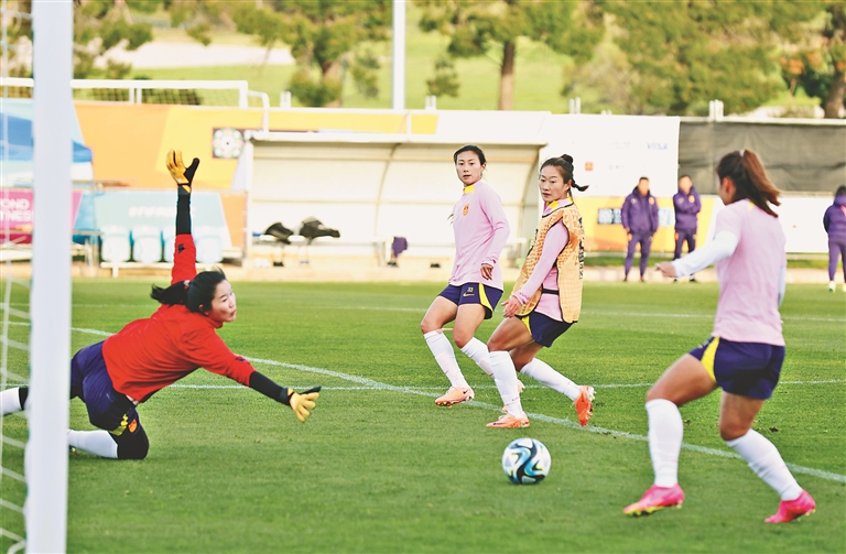 7月10日歸隊的王霜已完全融入,過障加速、接球射門,王霜彈無虛發(fā)。在6對6半場演練中,助理教練馬曉旭加入到王霜率領的黃隊,與唐佳麗、張馨所在的紅隊展開對攻大戰(zhàn)。快速的攻防轉(zhuǎn)換、漂亮的進球讓看臺上的球迷興奮不已,有球迷甚至打開了手機直播。