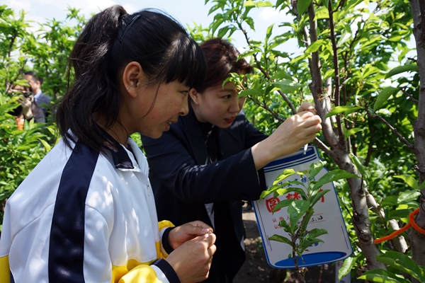 儀式后,與會(huì)領(lǐng)導(dǎo)和孩子們一同參觀青春果園,在“希望”“圓夢”“愛心”等六棵樹下共同掛上“哈藥小藍(lán)瓶”手工制品。