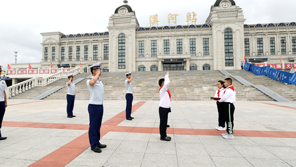 在國(guó)旗下,漠河市邊境檢查站代表陳澤和“全區(qū)十佳駐村干部”王成龍用自己生動(dòng)的故事為在場(chǎng)的每位少先隊(duì)員們上了一堂生動(dòng)的國(guó)防教育課,漠河市的少先隊(duì)員代表王涵在國(guó)旗下表達(dá)了對(duì)祖國(guó)的熱愛和對(duì)戍邊工作者們的敬佩。團(tuán)省委副書記陳海萍在講話中鼓勵(lì)少先隊(duì)員要學(xué)習(xí)漠河戍邊工作者們的堅(jiān)韌不拔和無私奉獻(xiàn),要立足祖國(guó)最北方志存高遠(yuǎn)、勤奮學(xué)習(xí)、錘煉品德、強(qiáng)健體魄,敢于創(chuàng)新、富于創(chuàng)意、樂于創(chuàng)造,要沿著“入隊(duì)、入團(tuán)、入黨”的“人生三部曲”奮力前進(jìn),為推進(jìn)中國(guó)式現(xiàn)代化、實(shí)現(xiàn)強(qiáng)國(guó)復(fù)興偉業(yè)貢獻(xiàn)青春力量。