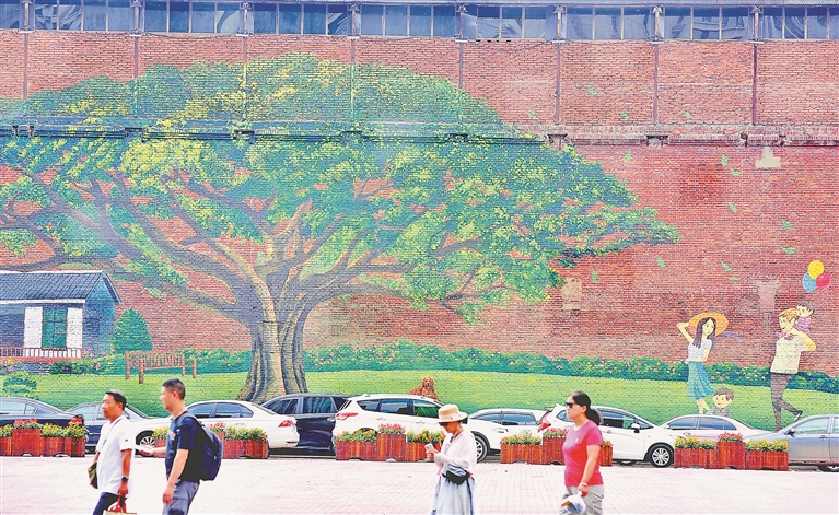哈爾濱市道外區(qū)東直路上,路邊的花卉景觀與墻體彩繪互相映襯,成為街頭一道美麗風(fēng)景,引得人們紛紛駐足觀看。畫里的溪流、小徑、樹木、花草、動(dòng)物與畫外的綠地巧妙結(jié)合起來,融為一個(gè)整體,創(chuàng)意新穎,視覺效果良好,讓人眼前一亮。